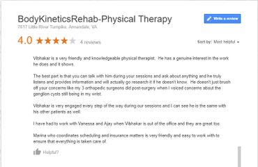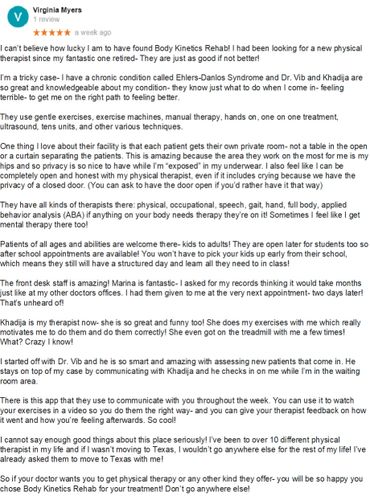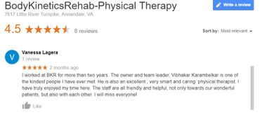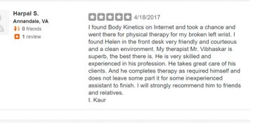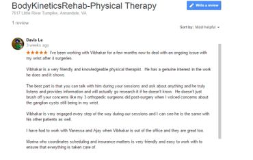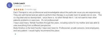 Body Kinetics Rehab staff works very hard and provides one on one tender care to all patients. Each session is customized to individual's needs. All our patients are our top priority.